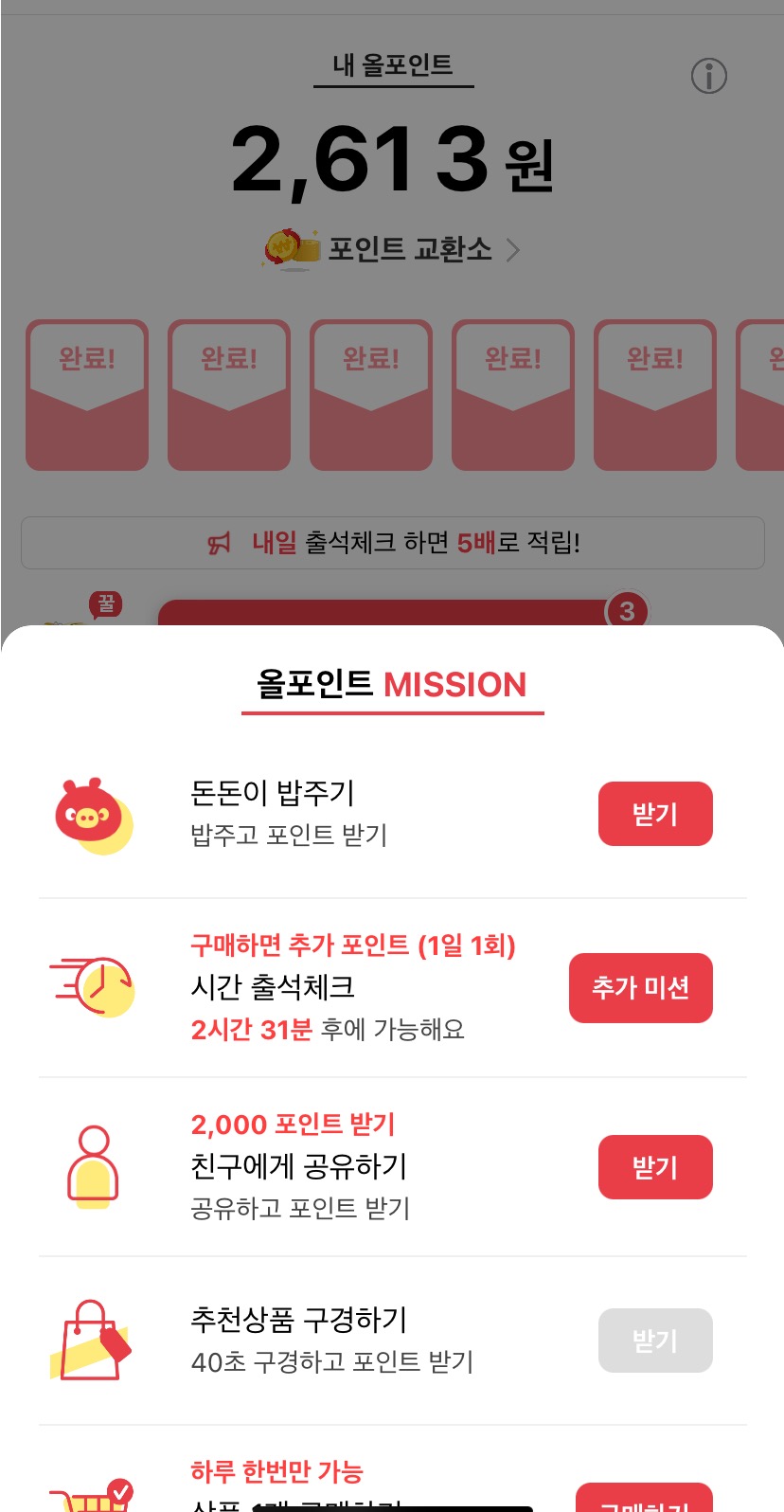 여기도 여러가지 미션을 통해서 출석체크겸 포인트롤 모을 수 있어요.