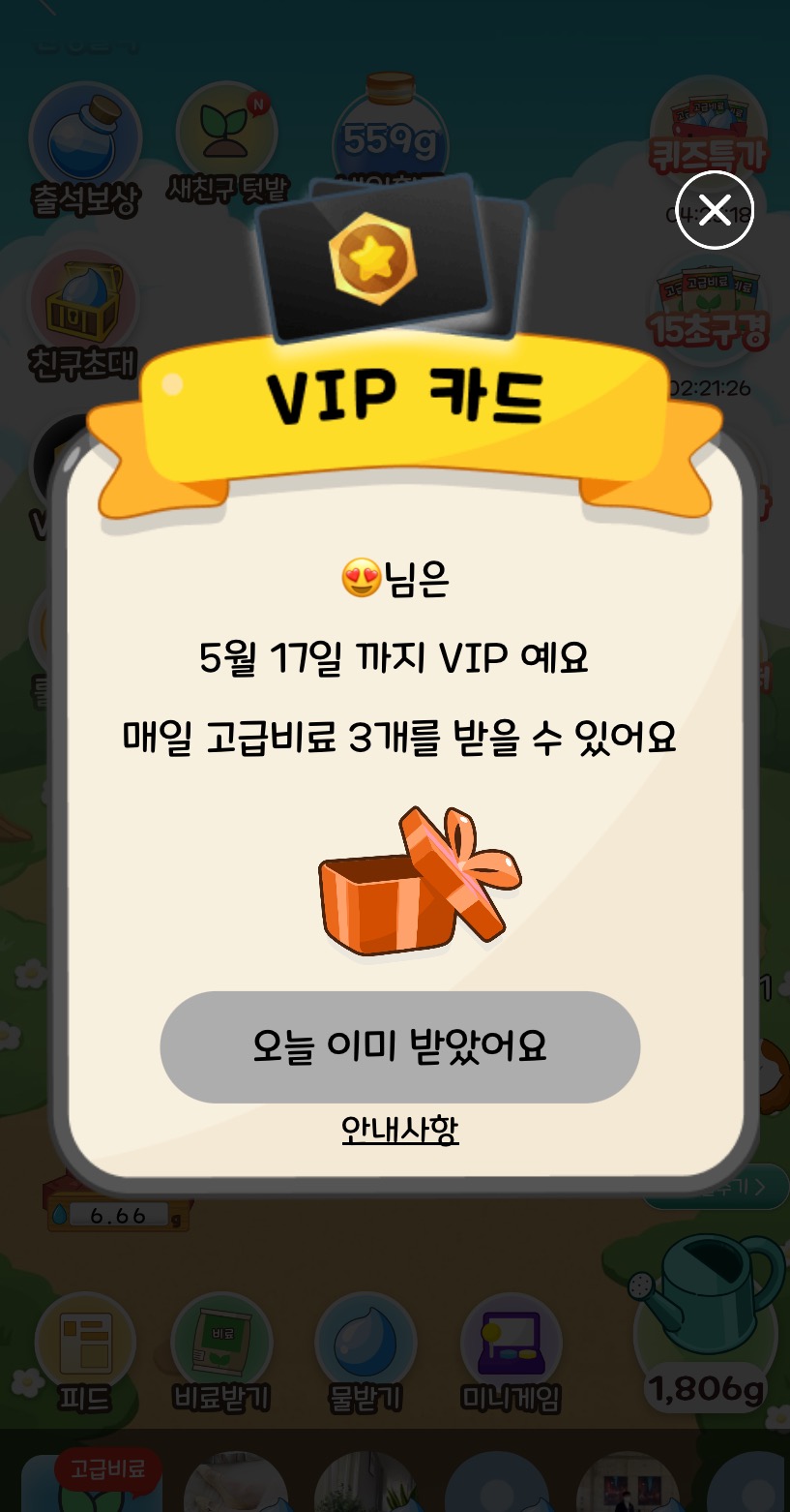 VIP초대링크로 친구초대하시면 서로 7일만 매일매일 고급비료3개씩 줘요...