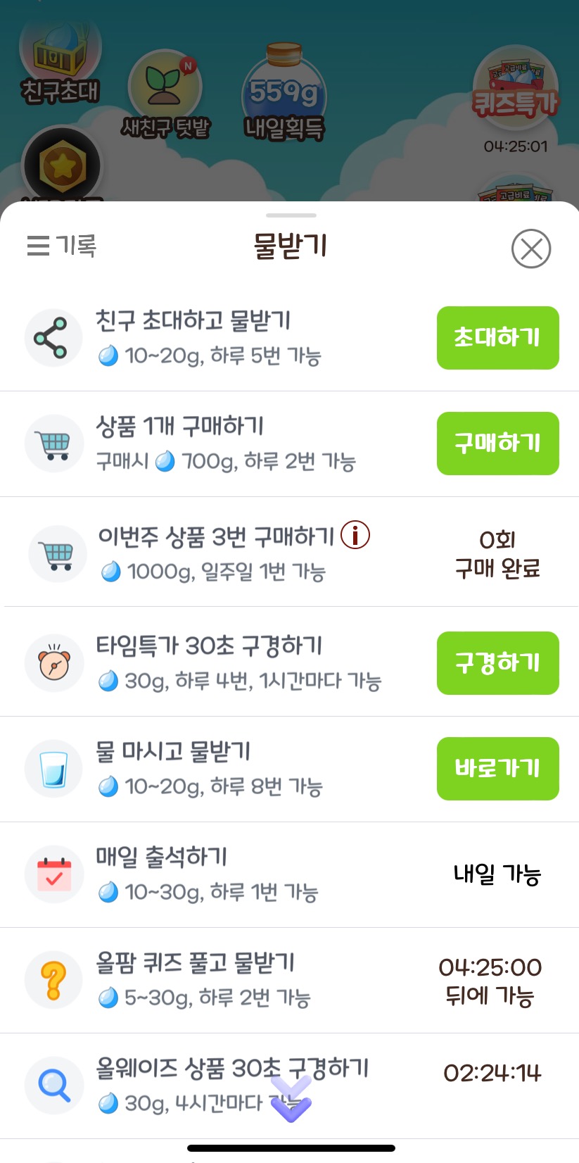 친구초대링크를 매일 누르고 들어오면 물 30g을 매일 받을 수 있다는 사실!!!
