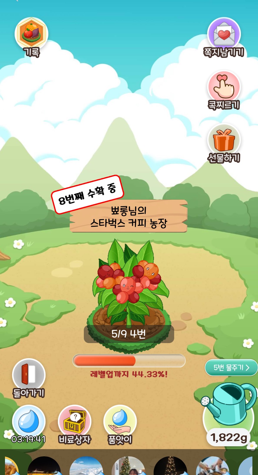 물과 양분인 비료를 줘서 무럭무럭 레벨업을 시키면 농작물이 수확이 됩니다.