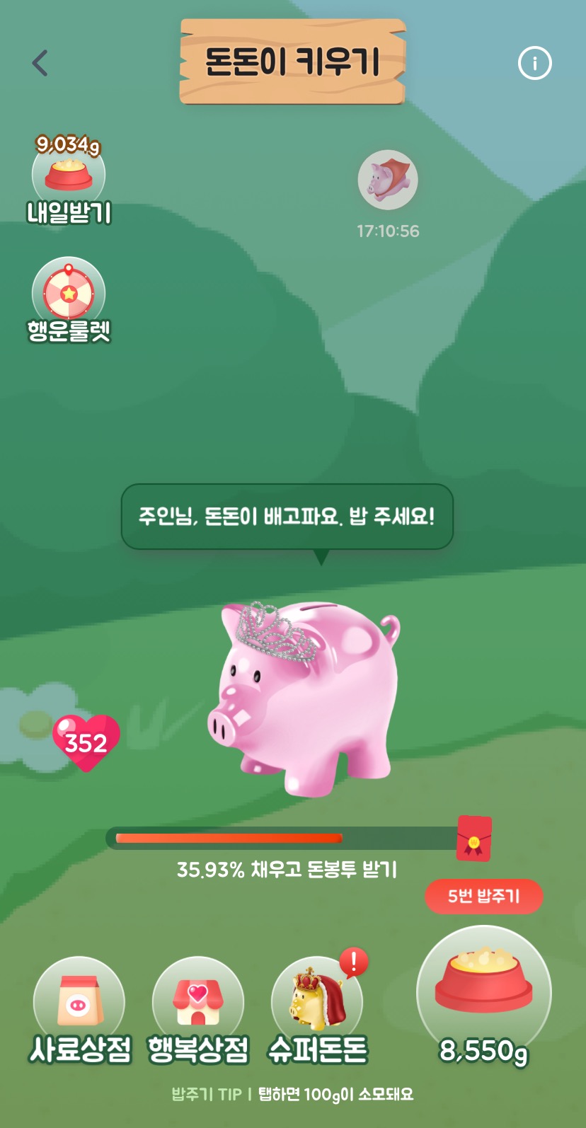 사료랑 행복상점에서 미션수행도 하면서 돈돈이에게 밥을 줘보세요.