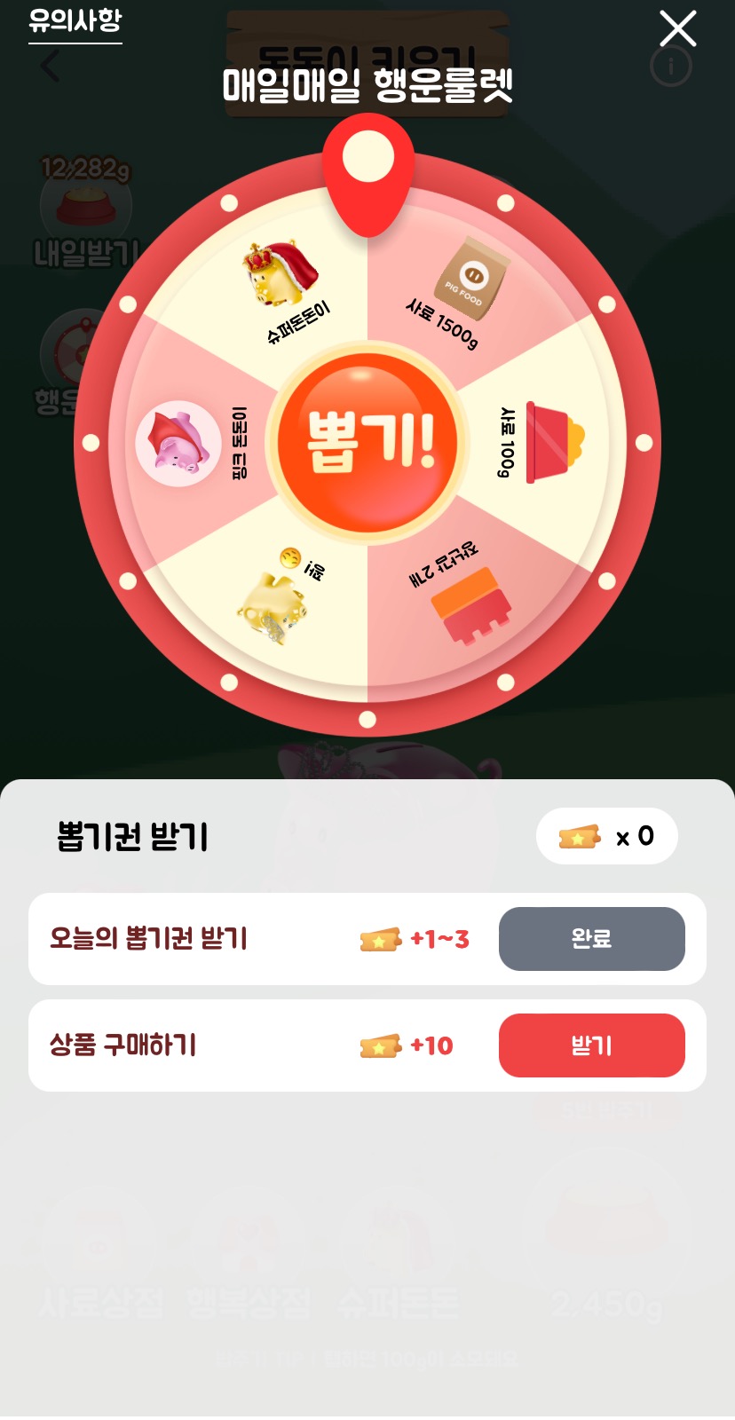 오늘의 뽑기권도 룰렛을 돌려서 1-3개 받아서 사료랑 이것저것 챙길 수 있어요.