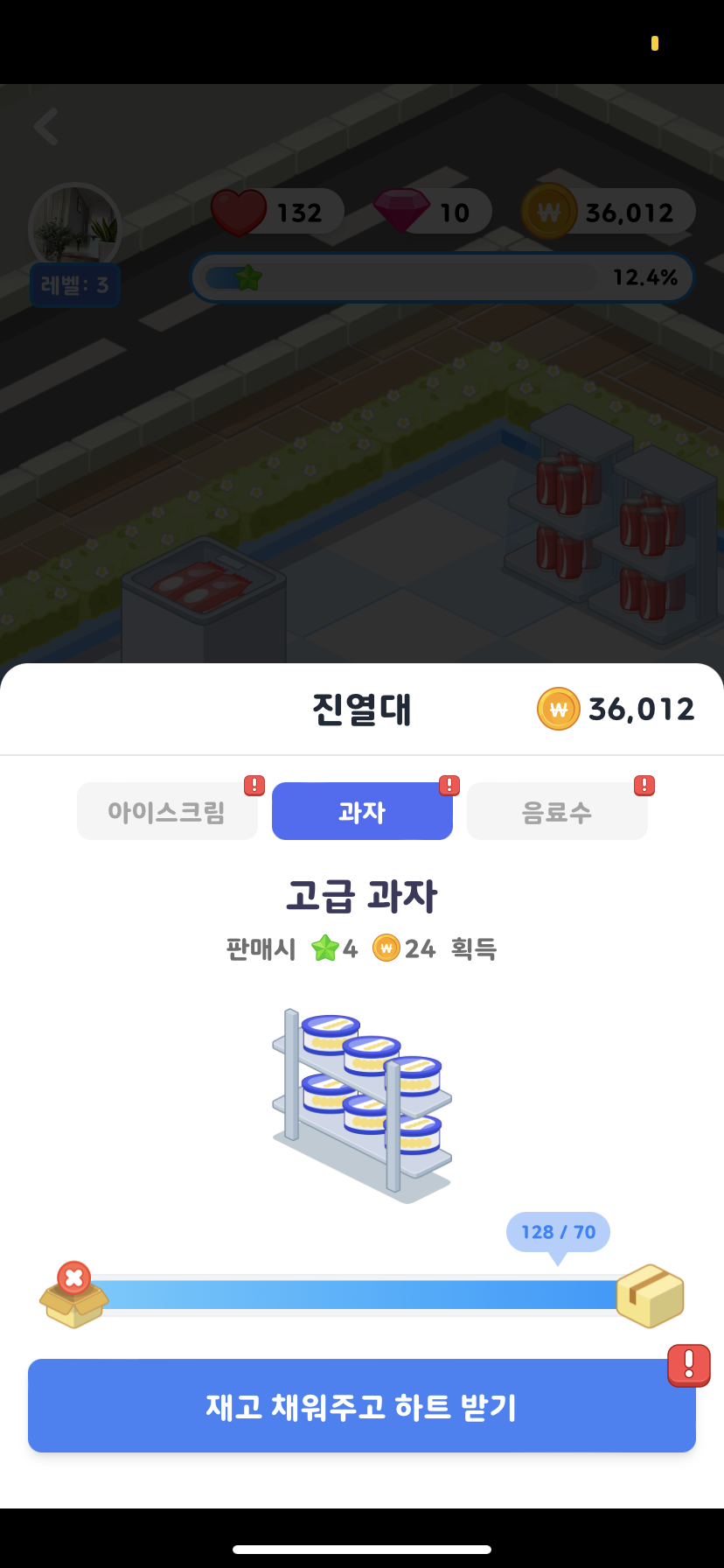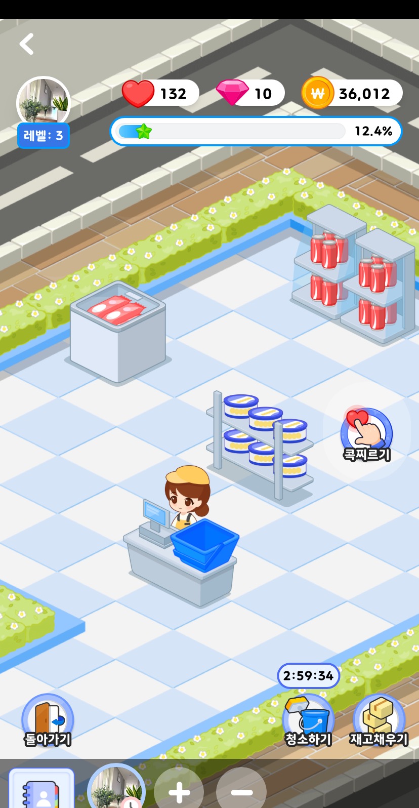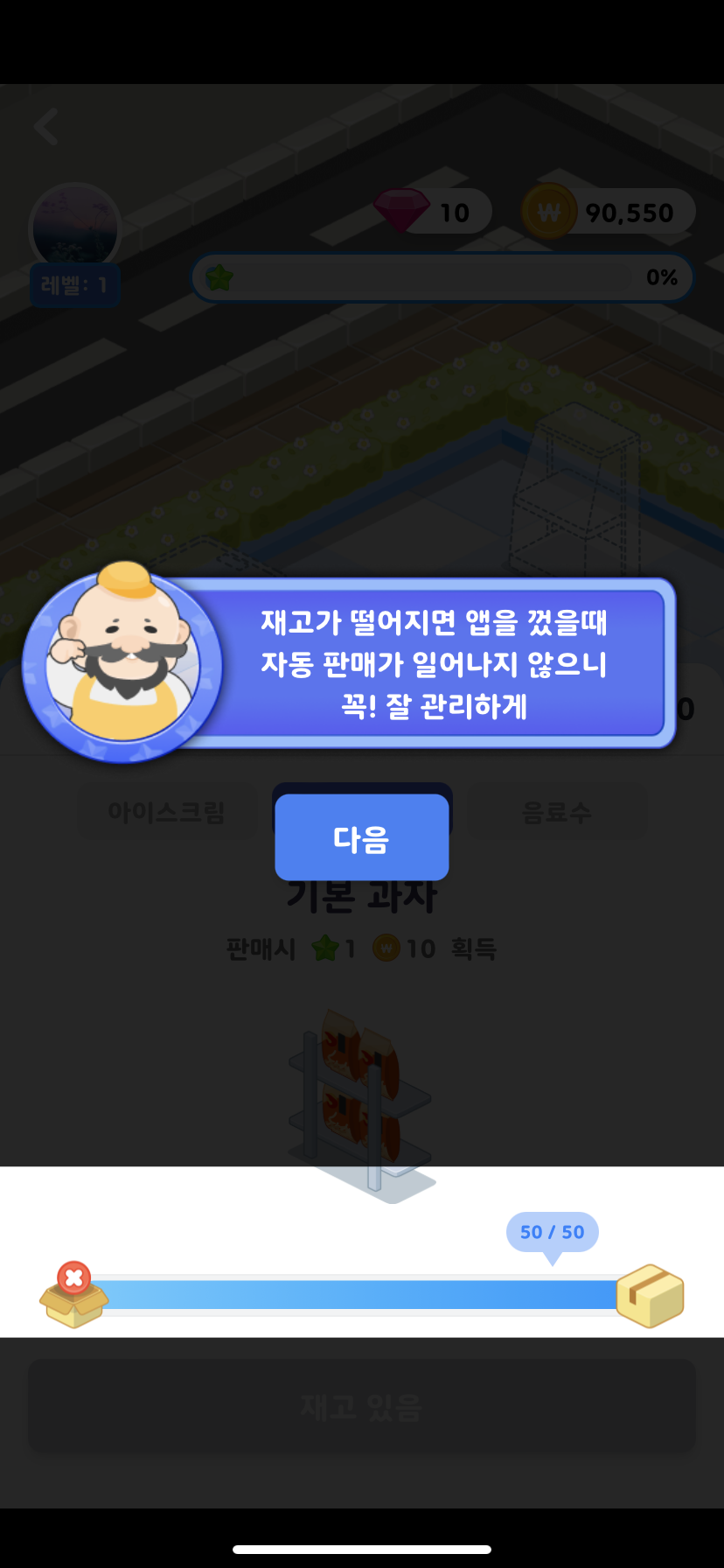 재고는 아까 말했듯이 아이스크림이나 과자 선반을 누르면 재고를 채울수 있는 광고보기 라던가 이런게 뜹니다.