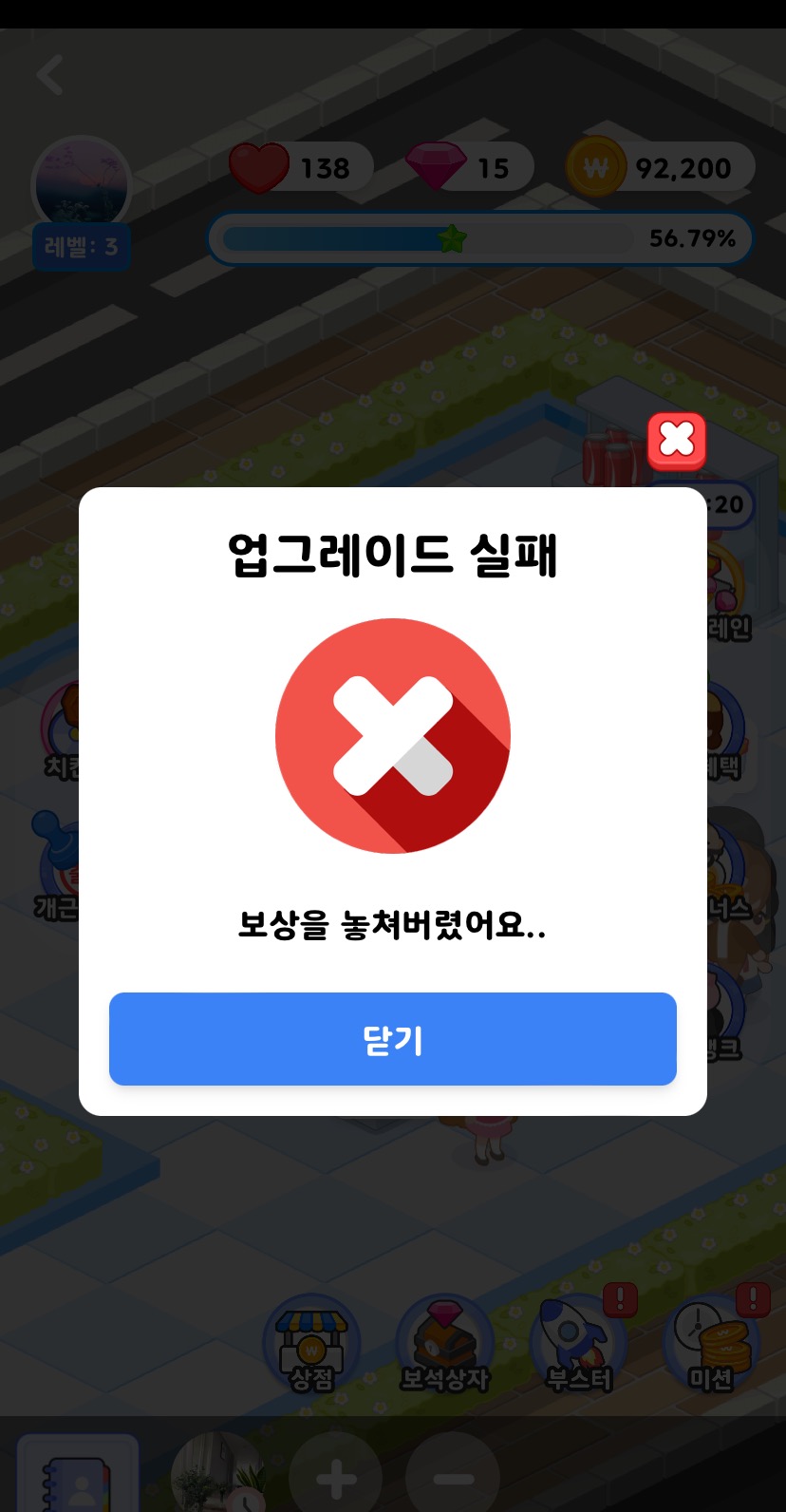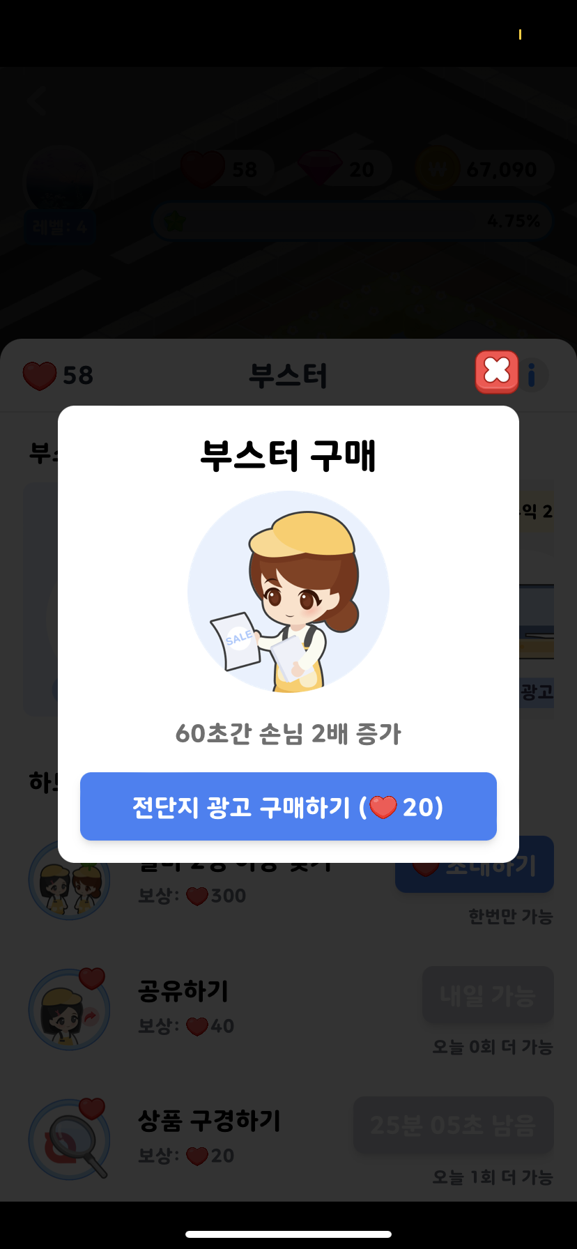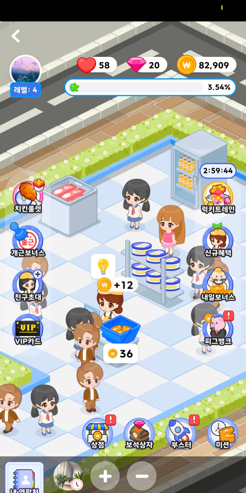 재고는 아까 말했듯이 아이스크림이나 과자 선반을 누르면 재고를 채울수 있는 광고보기 라던가 이런게 뜹니다.