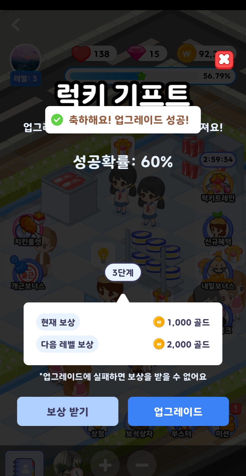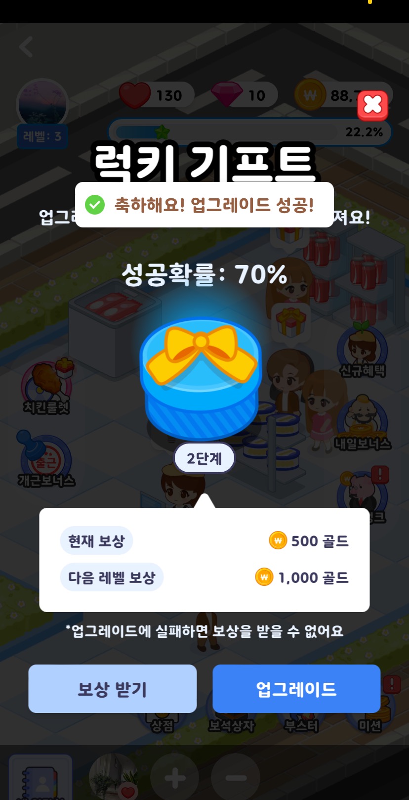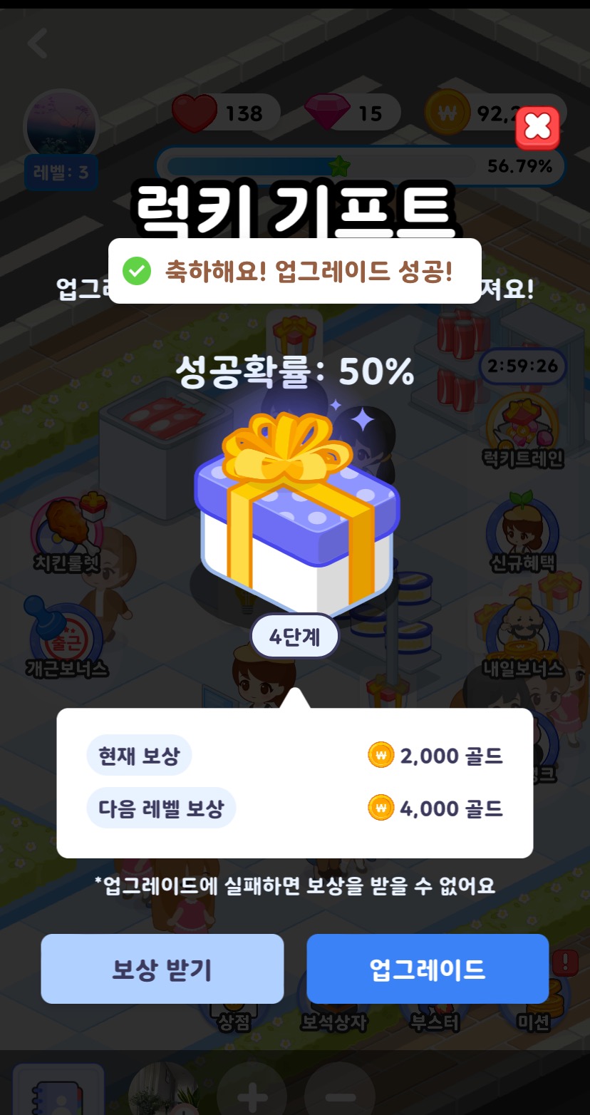 여기서 보상받기를 누르거나 업그레이드를 할수 있죠.