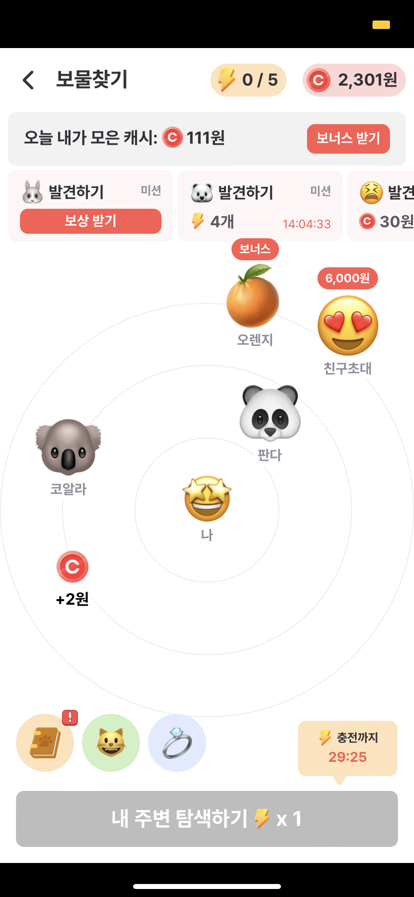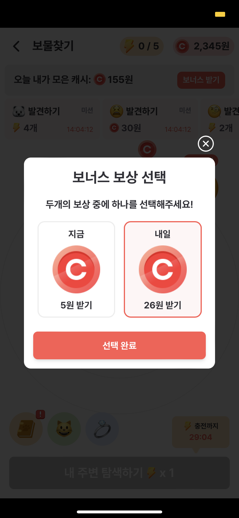 게다가 오늘 내가 모은캐시 옆에 보너스 받기 누르시면 보너스받기로 오늘당장 5원받기 내일 26원?내지 32원받기 이런식으로 뜹니다.