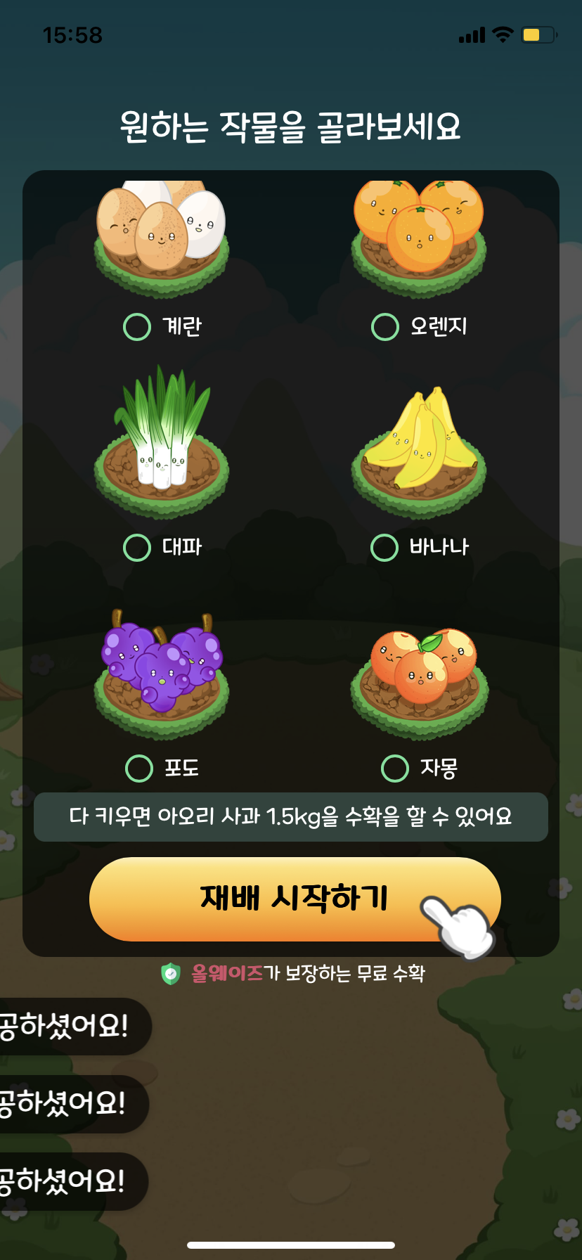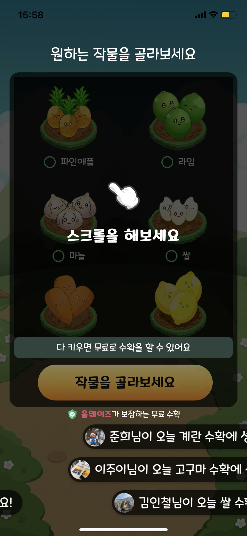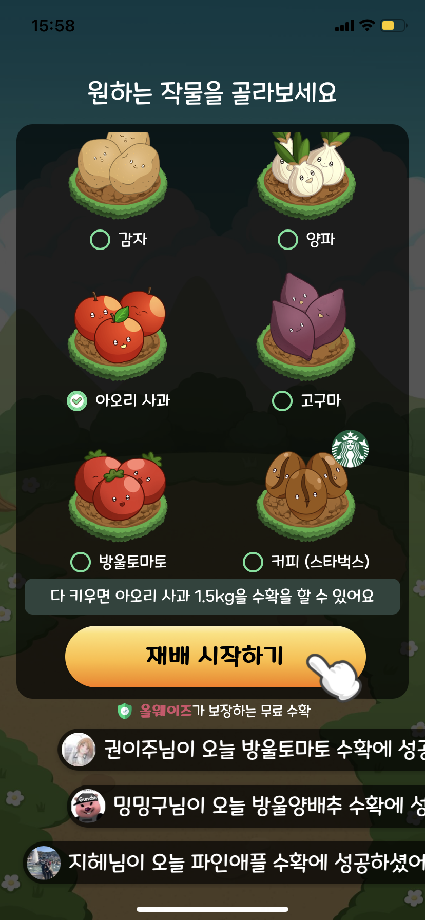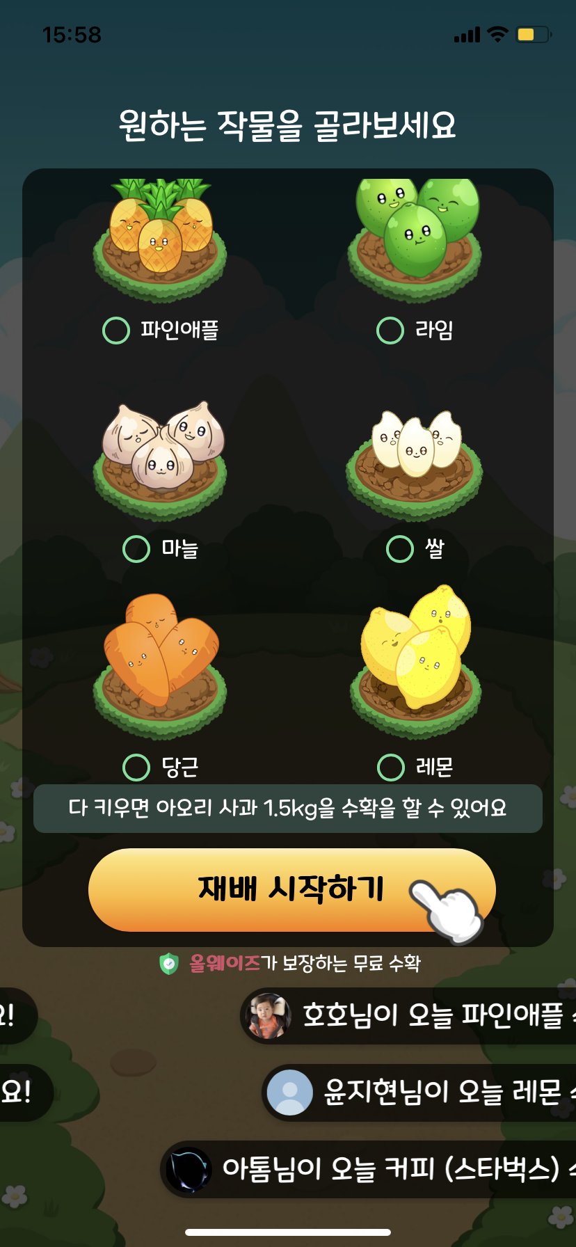원하는 작물을 선택해서 키워보세요. 다 키우면 무료로 보내드려요.
